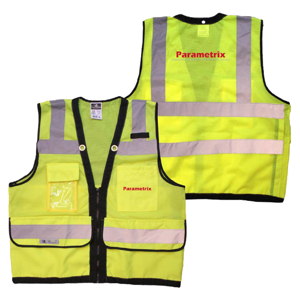 Radians Type R Class 2 Heavy Duty Surveyor Safety Vest is a heavy duty contractor Surveyor's vest with zipper closure and large back "plan" pocket. Built with rugged ANSI 107 Hi-Viz material, reinforced wear points, and long-wearing web reinforcement along outer edges. Mesh upper, front and back, for breathability and comfort. Pockets in tough woven twill fabric provide maximum durability.